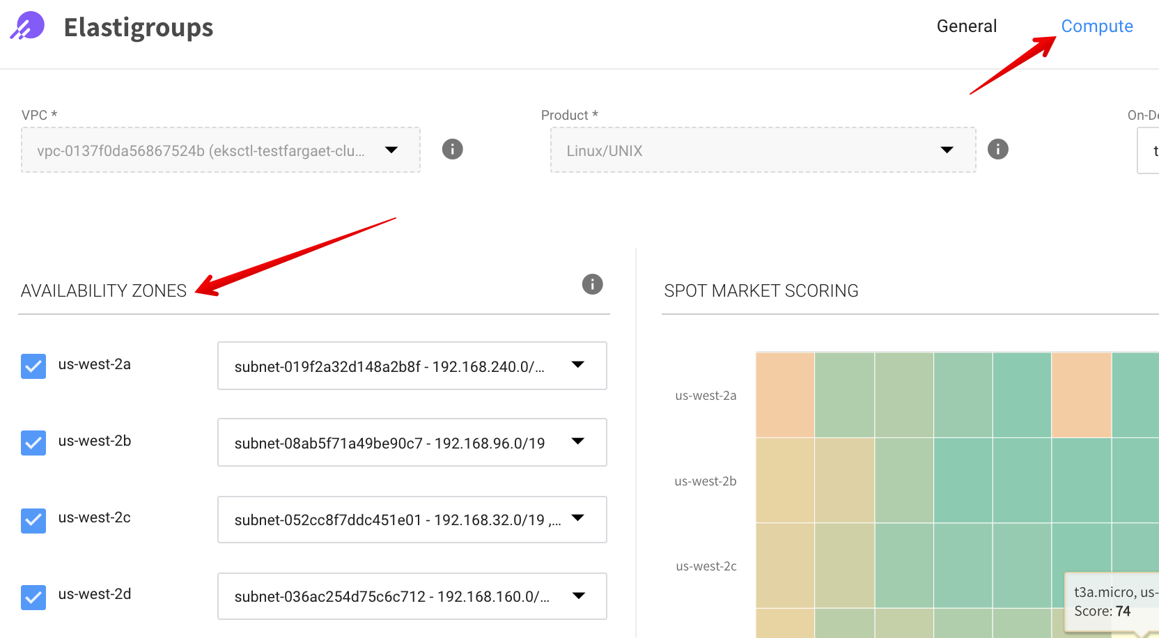 In the Compute tab, go to Availability Zones. (If you are creating a new Elastigroup, you must complete the required information in the General tab before you can enter the Compute tab.)