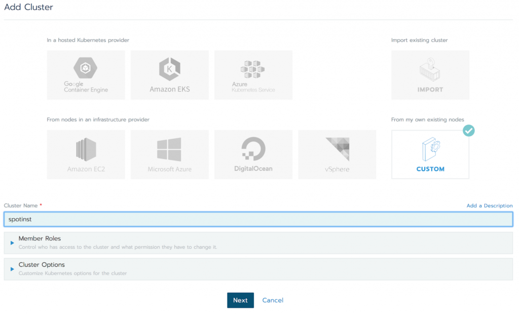 Spot integrates with Rancher 2.0 through the custom cluster configuration.