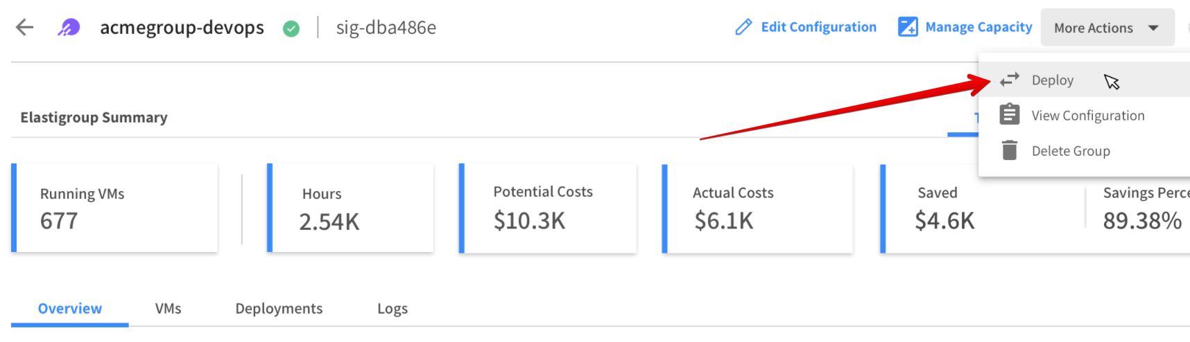 Alternatively, in the Elastigroups Summary click the Deployments tab and click Deploy.